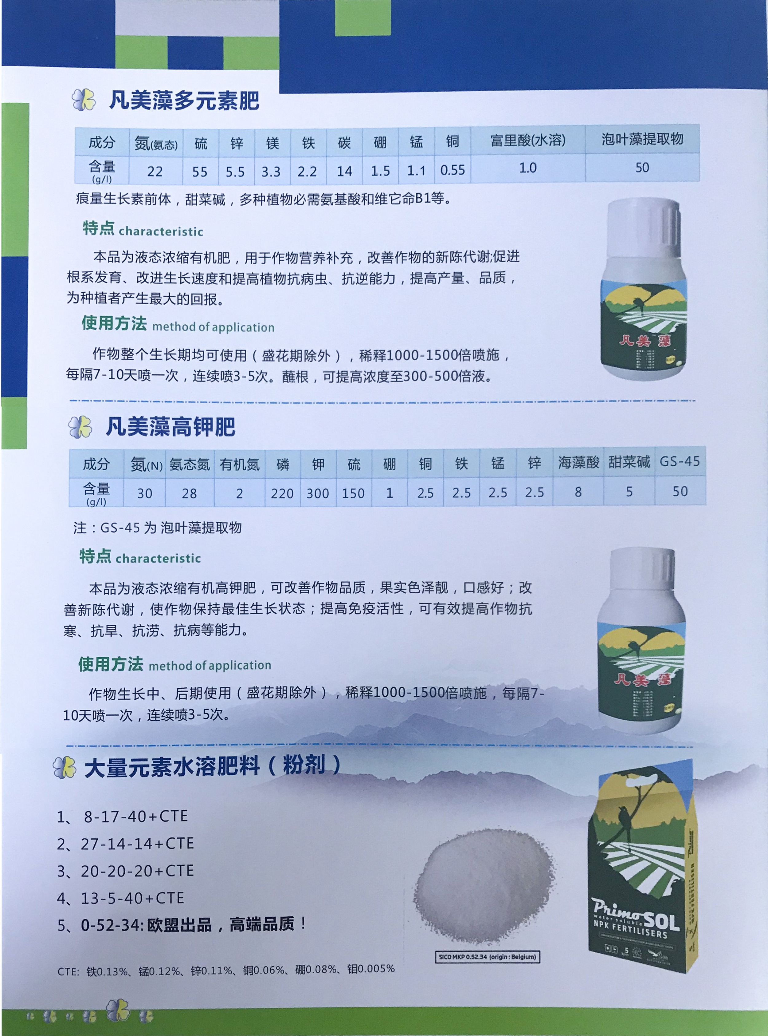 近年来,生物刺激素是农资市场的热点。生物刺激素既非植物营养又非农药,却是一类具有促进作物营养吸收,提高作物抗逆性,改善作物品质的生物源物质,特别是泡叶藻提取物,以其含有的生物活性物质之丰富而备受宠爱。通常这类物质会跟植物无机营养搭配在一起,以更好地促进作物健康生长。为此特地引进比利时全系列水溶肥,包括含泡叶藻系列的有机水溶肥。希望此类新肥料为作物健康生长提供有力的物质支持,为农产品的品质改善提供新的动力支持,为农户的增收增效提供经济高效的生产工具。