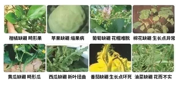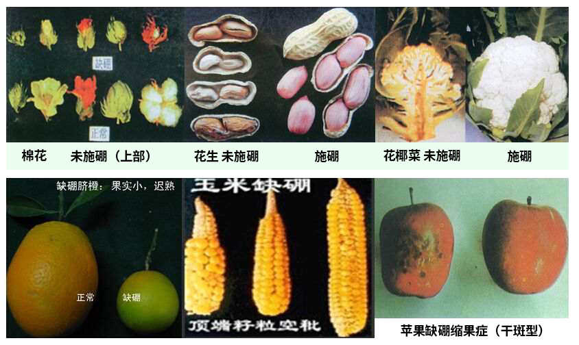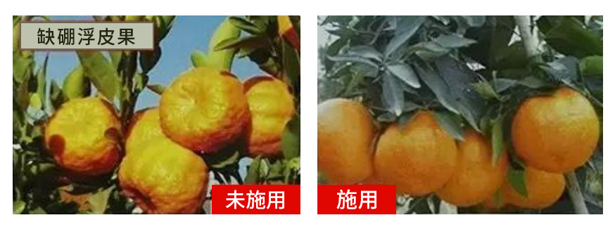 施用本品可以预防植物因缺硼引起的叶片糖类积聚,叶片变脆、变厚、畸形,叶柄裂化等问题。预防缺硼造成的缩皮、小果、软果、畸形果、缩果病等。促进钙、糖和植物内源激素的运转,稳定细胞,防裂果,促进果形周正,商品果比率高。