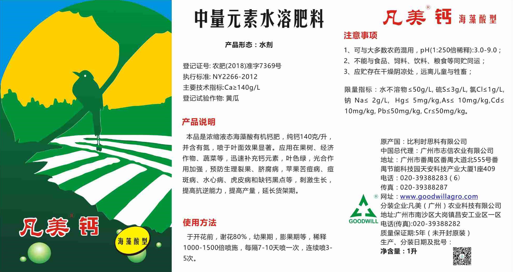 凡美钙海藻酸型中量元素水溶肥料是一种浓缩、速效液体含海藻酸的有机钙肥,可改善作物缺钙时根系局部腐烂;幼叶尖端变钩形,深浓绿色,新生叶很快枯死;花朵萎缩、核果类果树易得流胶病和根癌病等症状。