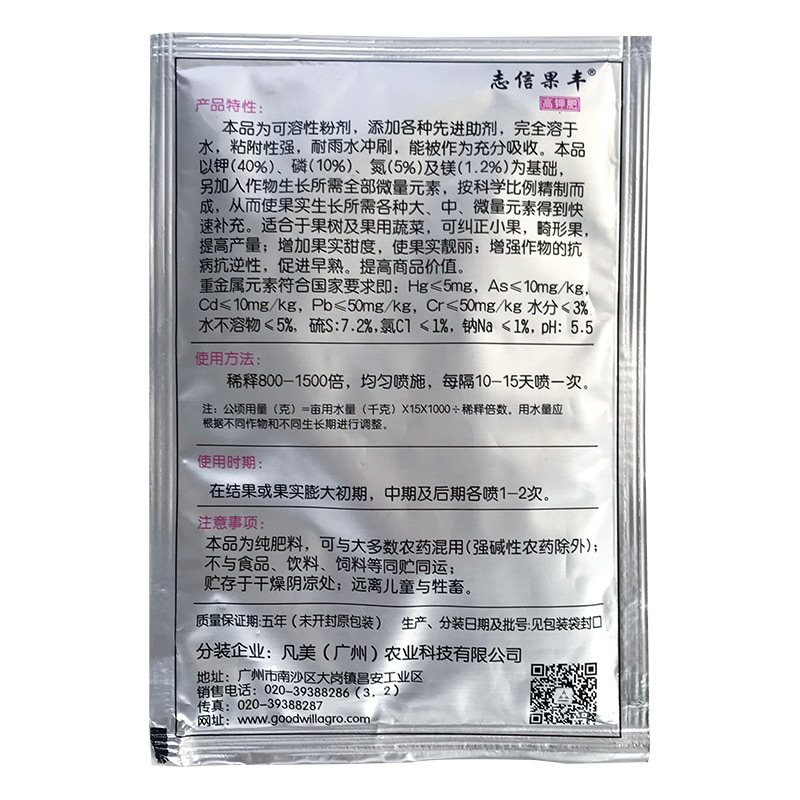 Ingredient Content: K2O:40%,P2O5:10%,N:5%,Mg:1.2%,Mo:0.005‰,B:0.02%,Mn:0.1%,Zn:0.2%,Cu:0.1%,Fe:0.1%